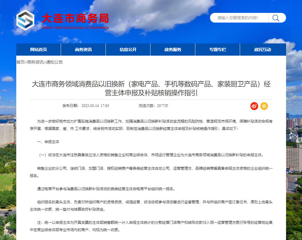 大连市商务领域消费品以旧换新(家电产品、手机等数码产品、家装厨卫产品)经营主体申报及补贴核销操作指引